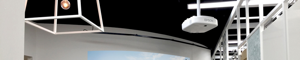 An Epson EB-G6070WNL 5,500 ANSI Lumens Projector with an ELPLU01 short throw lens was installed to a 2m ceiling post. Installed at around 2.7 metres from the curved wall surface, the Epson G-Series projector delivered a stunning 4.2m wide x 2.6m high projection image. Geometric correction was used to achieve a squared display against the convex wall.