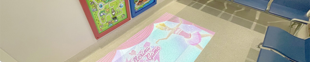 The interactive floor projection system engages patients and visitors, providing a dynamic and entertaining waiting room experience.