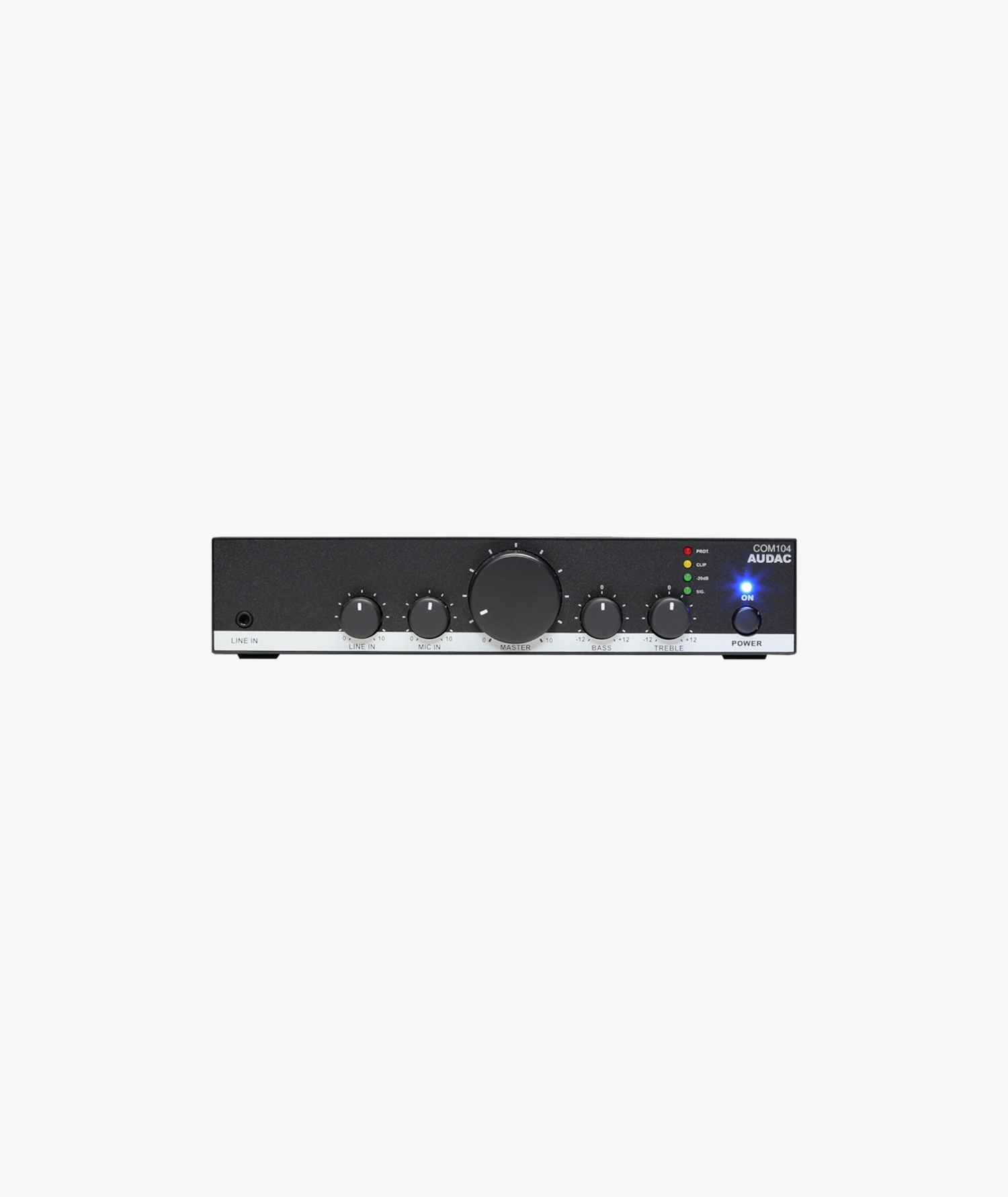 The COM104 includes a stereo line input for audio sources such as media players and radio tuners, as well as a balanced mic/line input for an announcement microphone, with integrated phantom power (15V) for condenser mics. A priority switch allows the background music to be overridden when announcements are made, while the wide gain adjustment (0 dB – +50 dB) ensures compatibility with voice file players.