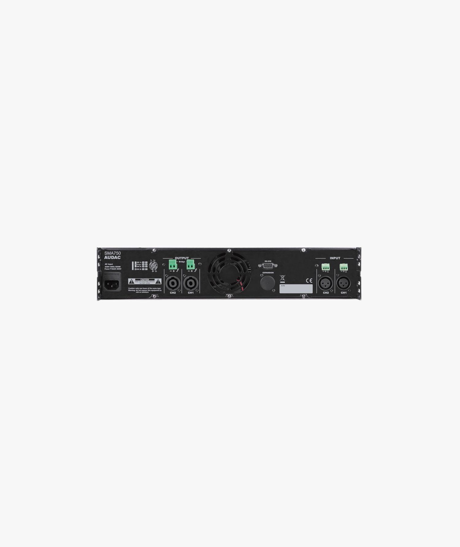 The Audac SMA750 WaveDynamics™ Dual-Channel Power Amplifier is a high-performance stereo amplifier designed for both fixed and mobile audio installations. Delivering 750W per channel, it ensures powerful, crystal-clear sound while offering advanced WaveDynamics™ DSP processing for optimal acoustic tuning. With an intuitive 2.5” LCD display, users can easily configure filters, equalization, delay and bass boost. The amplifier features password/USB-key protection, loudspeaker presets and an output power limiter for enhanced performance and speaker safety. Connectivity options include XLR, terminal block inputs, speaker outputs and RS-232 for system integration. An optional Dante™ interface enables seamless low-latency audio networking over Ethernet.