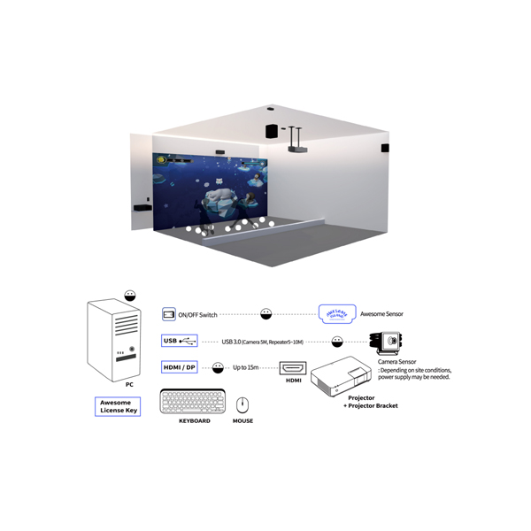 With the help of specialised equipment, children are given sheets where they can create and colour their very own characters. This system brings these drawings to life on the projected surface and within moments, children can interact with and watch their characters come to life, moving all across the screen.