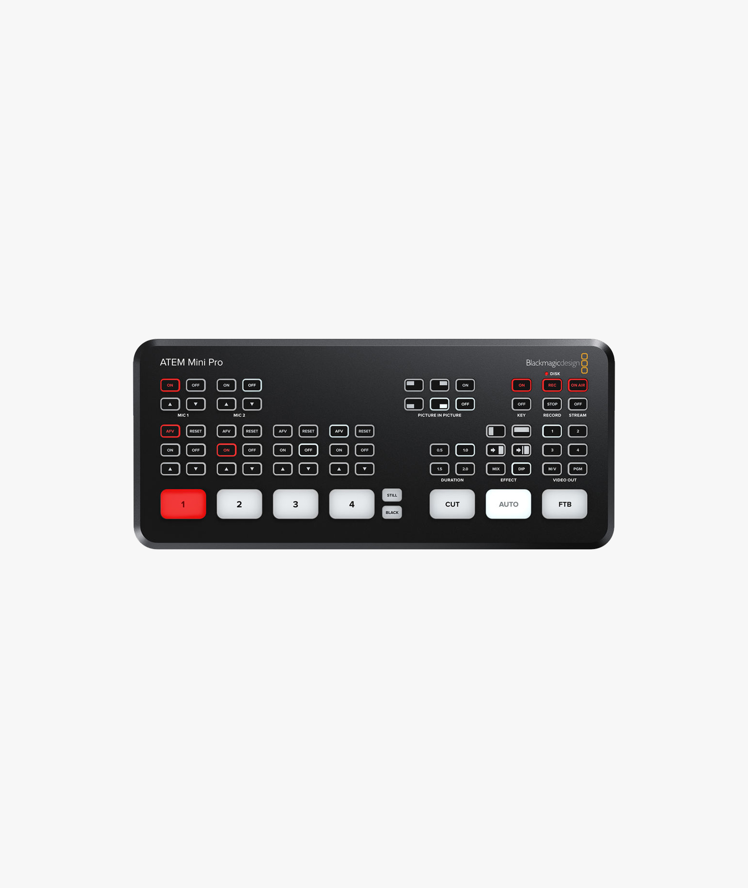 Equipped with a Fairlight audio mixer, the ATEM Mini Pro enables precise control over audio, featuring parametric EQ, compression and noise gate for each HDMI input. The built-in DVE (Digital Video Effects) supports picture-in-picture transitions, perfect for dynamic live content. You can also use the green screen chroma key feature and store up to 20 stills for titles, ensuring high-quality, professional-looking live productions.