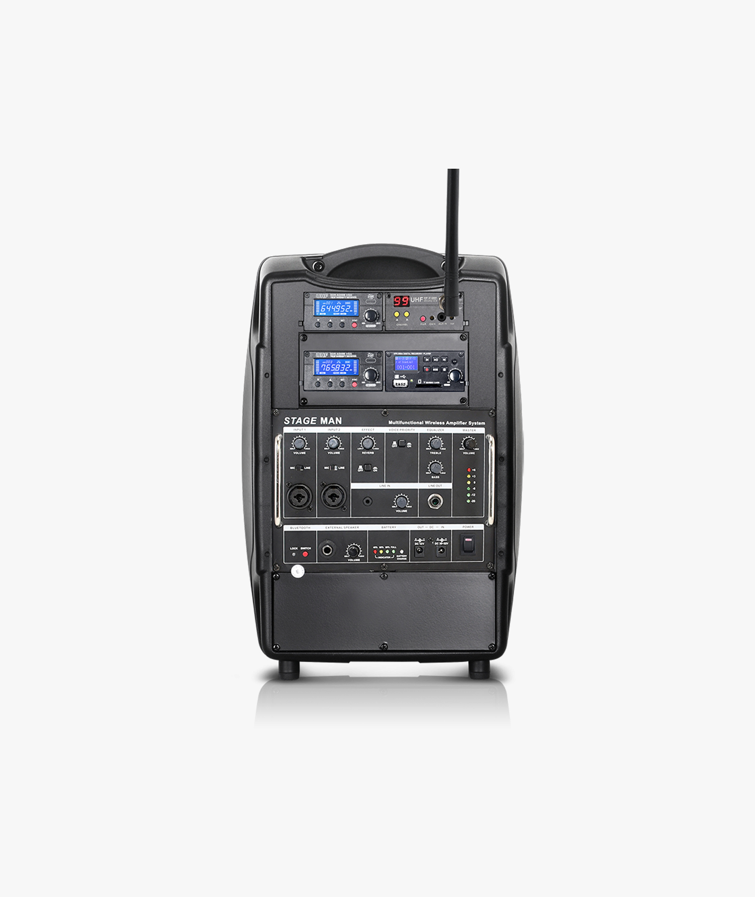The Stage Man supports up to four wireless microphones simultaneously, allowing for seamless communication during events. Its long-lasting lithium battery provides over 10 hours of continuous use, making it perfect for outdoor events or performances without worrying about power. With Bluetooth capabilities for easy music playback and the option to connect to external speakers or amplifiers, the Stage Man is the ultimate solution for any event that demands quality sound and reliability.